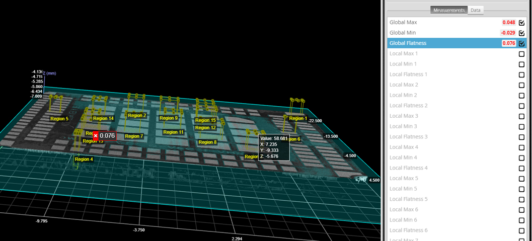 PCB板的金手指一般采用金属材质,一般都为密集排布在固定的区域。 每颗金手指在PCB板上高度的一致性直接决定了最终产品的接触是否良好,在各产线中某一颗金手指的漏装或重复安装,直接会导致整张PCB板报废。 传统的2D检测方式无法检测每个金手指的高度数据,即无法算出平面度,只能采用3D测量方式。 通过3D传感器采集的每个金手指三坐标数据结合SAGENS算法工具即可轻松实现平面度检测。